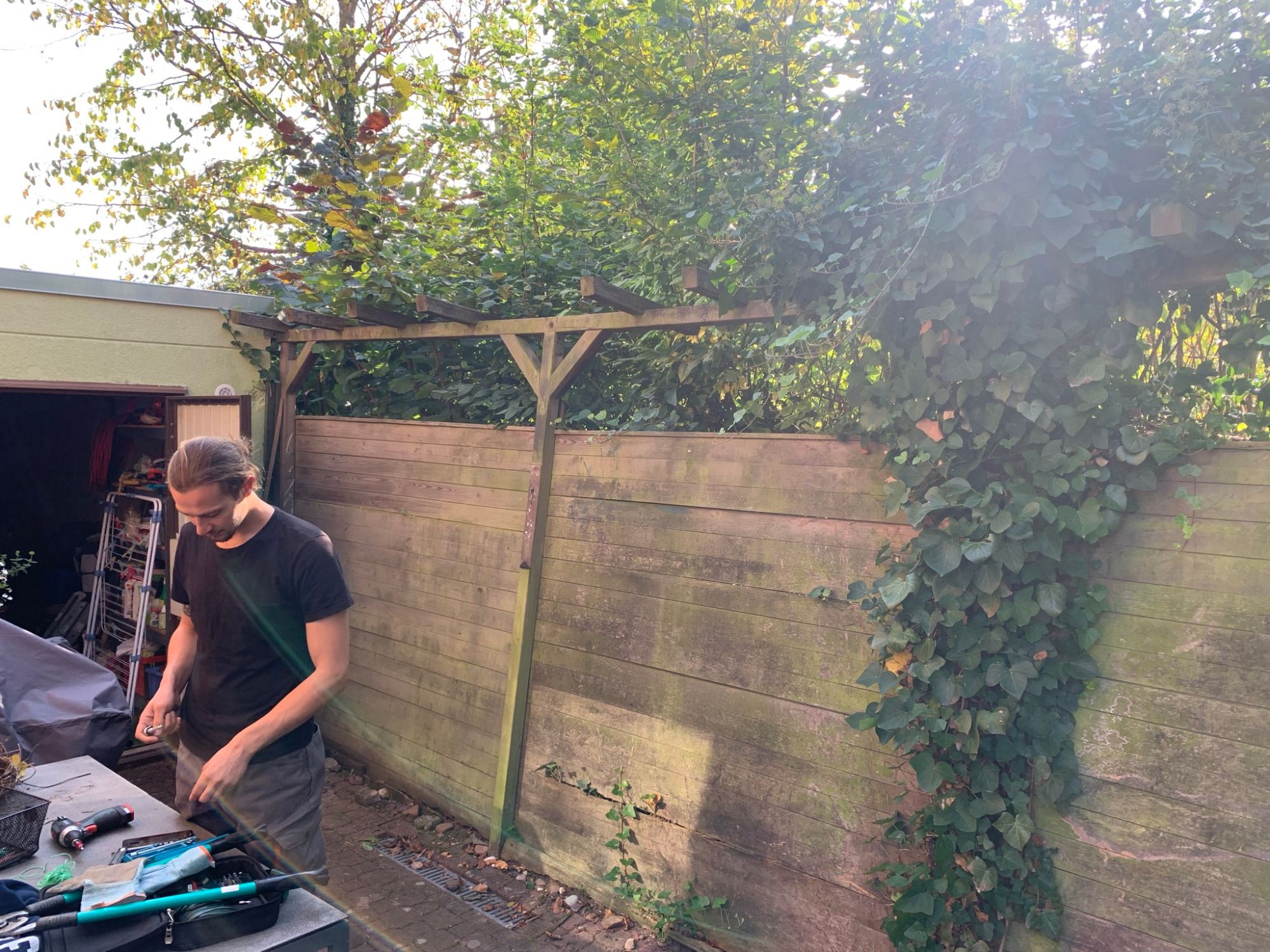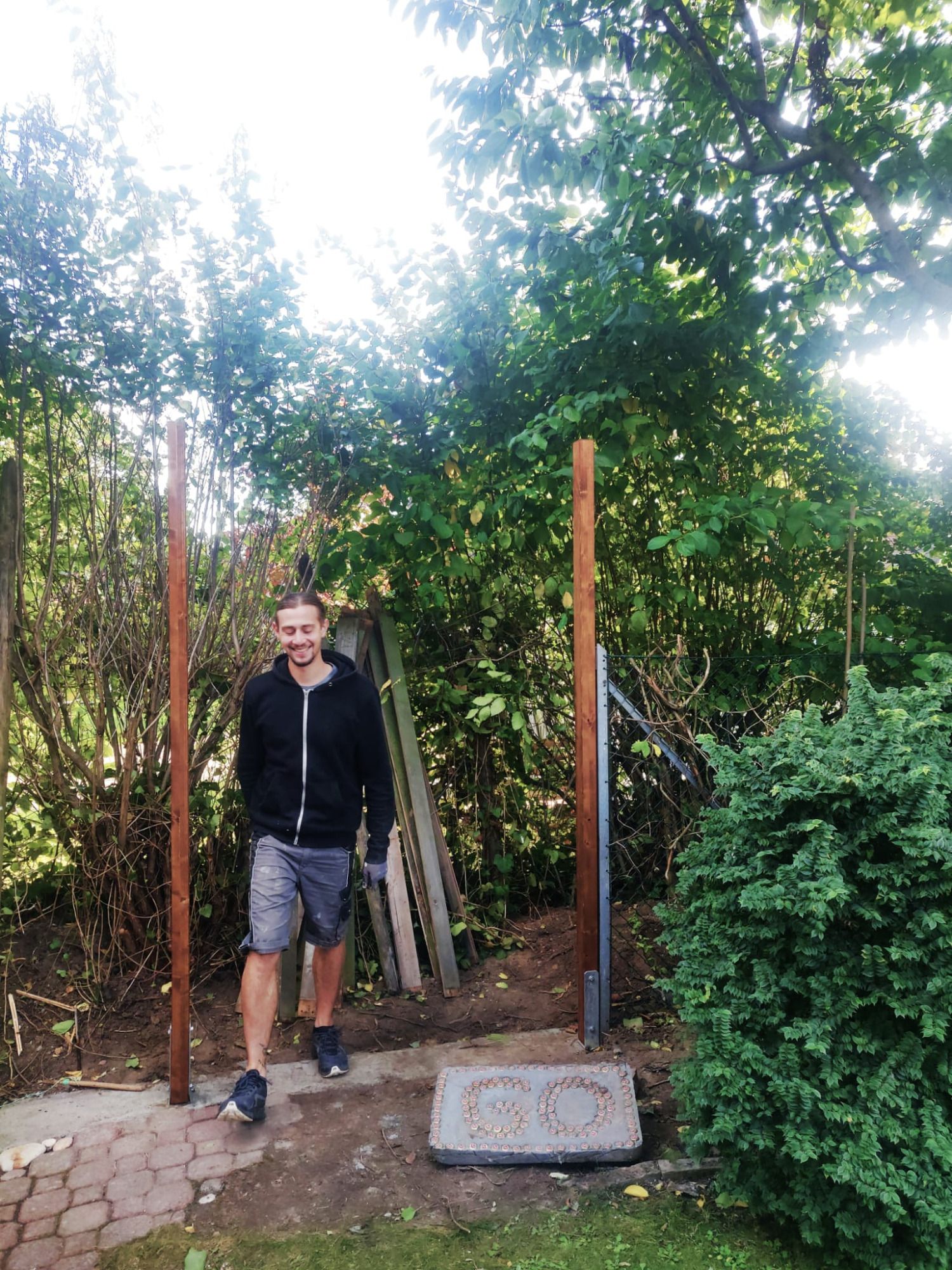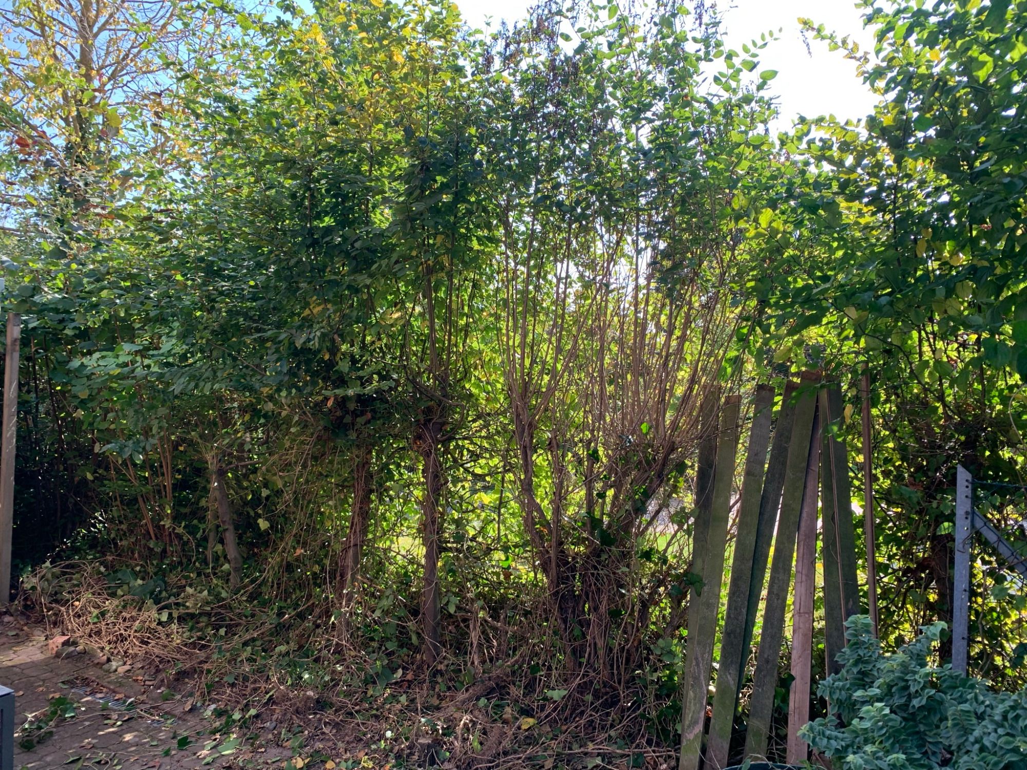 Der in die Jahre gekommene Zaun (steht schon fast dreißig Jahre) ist total windschief. Er soll ersetzt werden durch einen offenen Sichtschutz zum Teil gemauert und mit den alten Brettern .